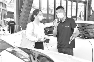 6月6日,在北京华熙LIVE·五棵松商业街区举办的“北京消费季之悦动海淀”活动现场,工作人员(右)向市民介绍一款汽车的配置。当日,北京消费季正式开启,进一步推动北京各行业复商复市,加快实现消费回暖。